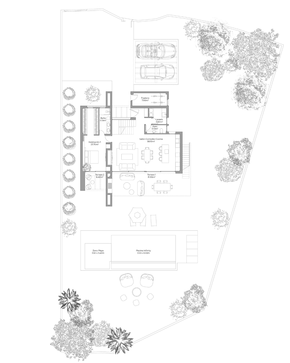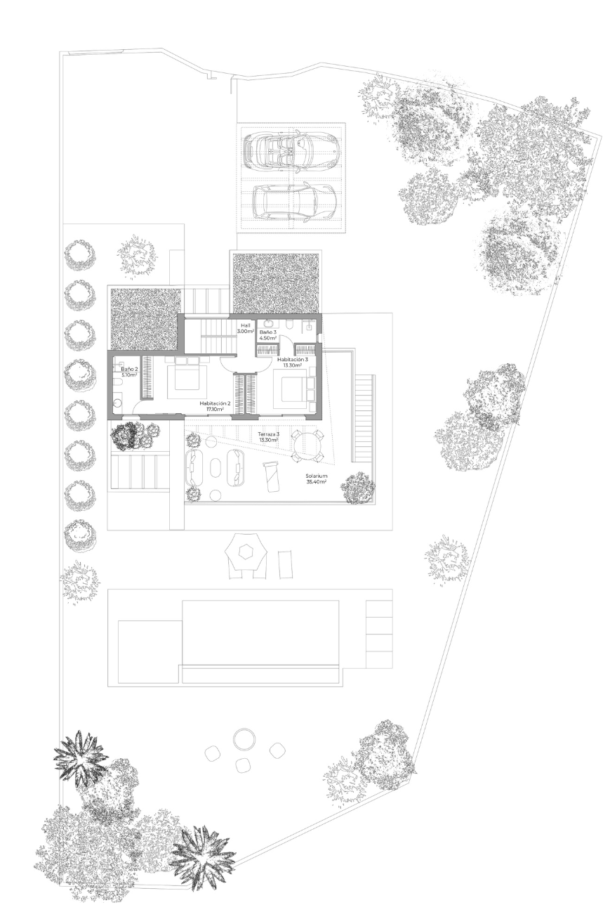 El dormitorio principal en suite puede beneficiarse tanto del acceso directo a la extensa terraza a nivel del suelo y la piscina, así como de estar ubicado en el primer piso con su propia terraza privada en la azotea, manteniendo la máxima privacidad. Todas las demás habitaciones se benefician de amplios acristalamientos de suelo a techo, baños en suite y armarios empotrados.